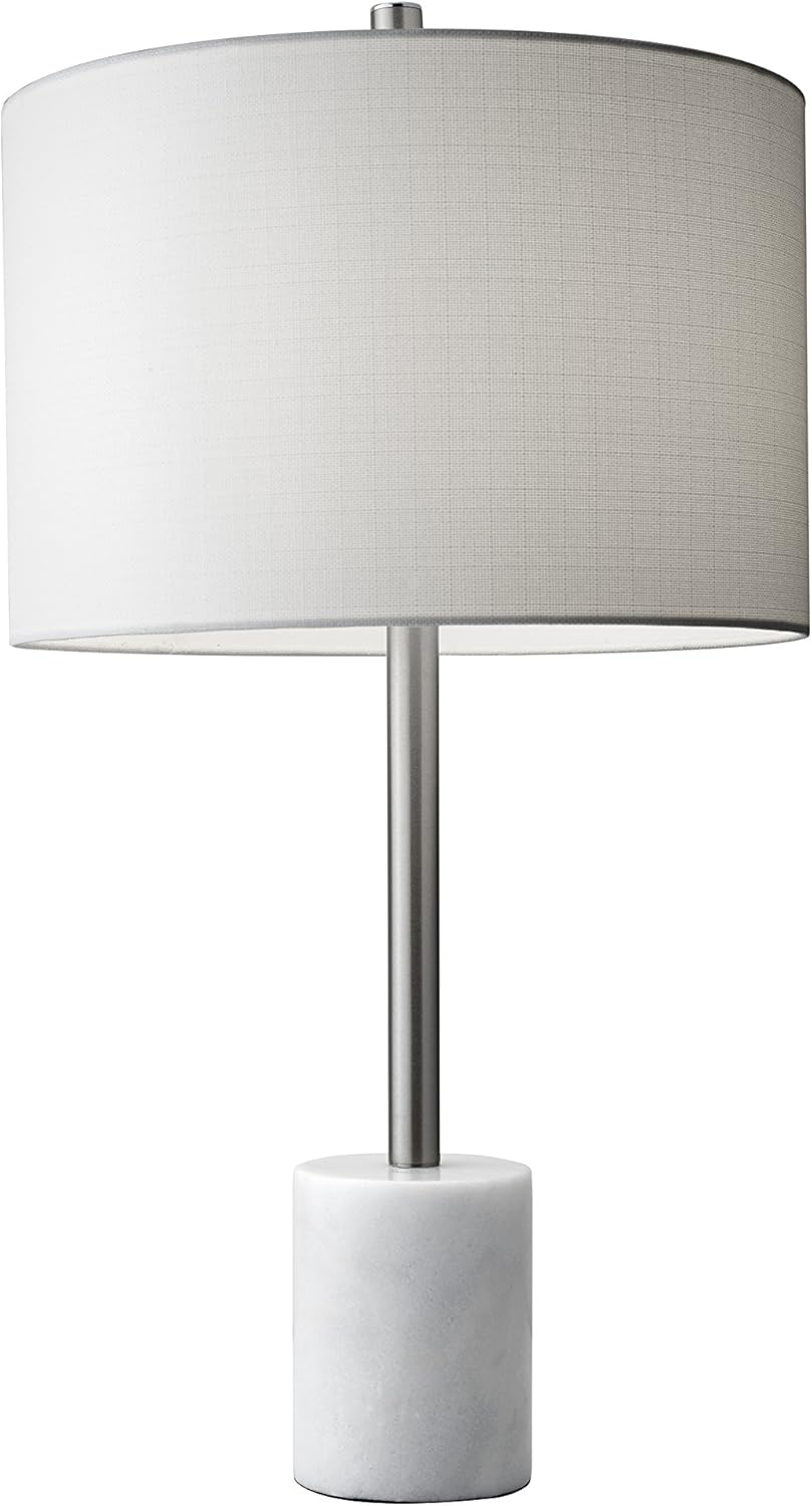 The Blythe Table lamp pairs sleek brushed steel with a chunky white marble base for a sophisticated, yet contemporary look. An elegant white Paris linen shade finishes off the look. The beauty of the Blythe collection lies in the simplicity of its design and the delicate details of the shade texture and marble grain. A 3-Way rotary switch on the socket controls light output of a 100 Watt incandescent bulb or equivalent CFL. The 3-way rotary socket switch will only work with a 3-way light bulb; otherwise this lamp will function with simple on/off switch at its highest setting. This lamp has a clear cord and is smart outlet compatible. Bulb is not included.